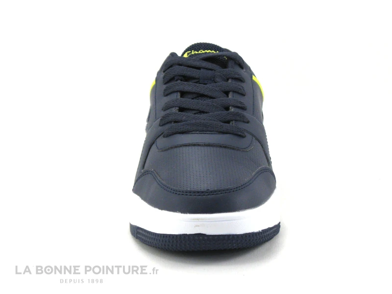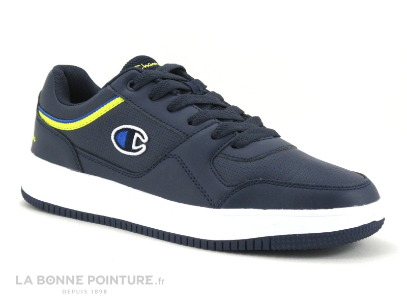 Cette basket de ville Homme Champion est en simili cuir bleu marine, avec des lignes jaunes et bleu royal sur les cÎtés.