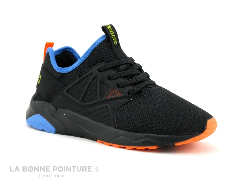 Un large élastique noir habille l’arrière de la chaussure de sport enfant, marqué Kappa en jaune.