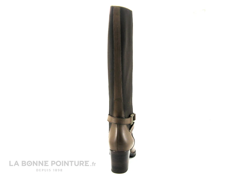 Cette botte Ă talon haut Ă©pais est en cuir lisse marron nuancĂ©, avec deux bandes Ă©lastique Ă l’arriĂšre pour ajouter de l’aisance dans la chaussure.